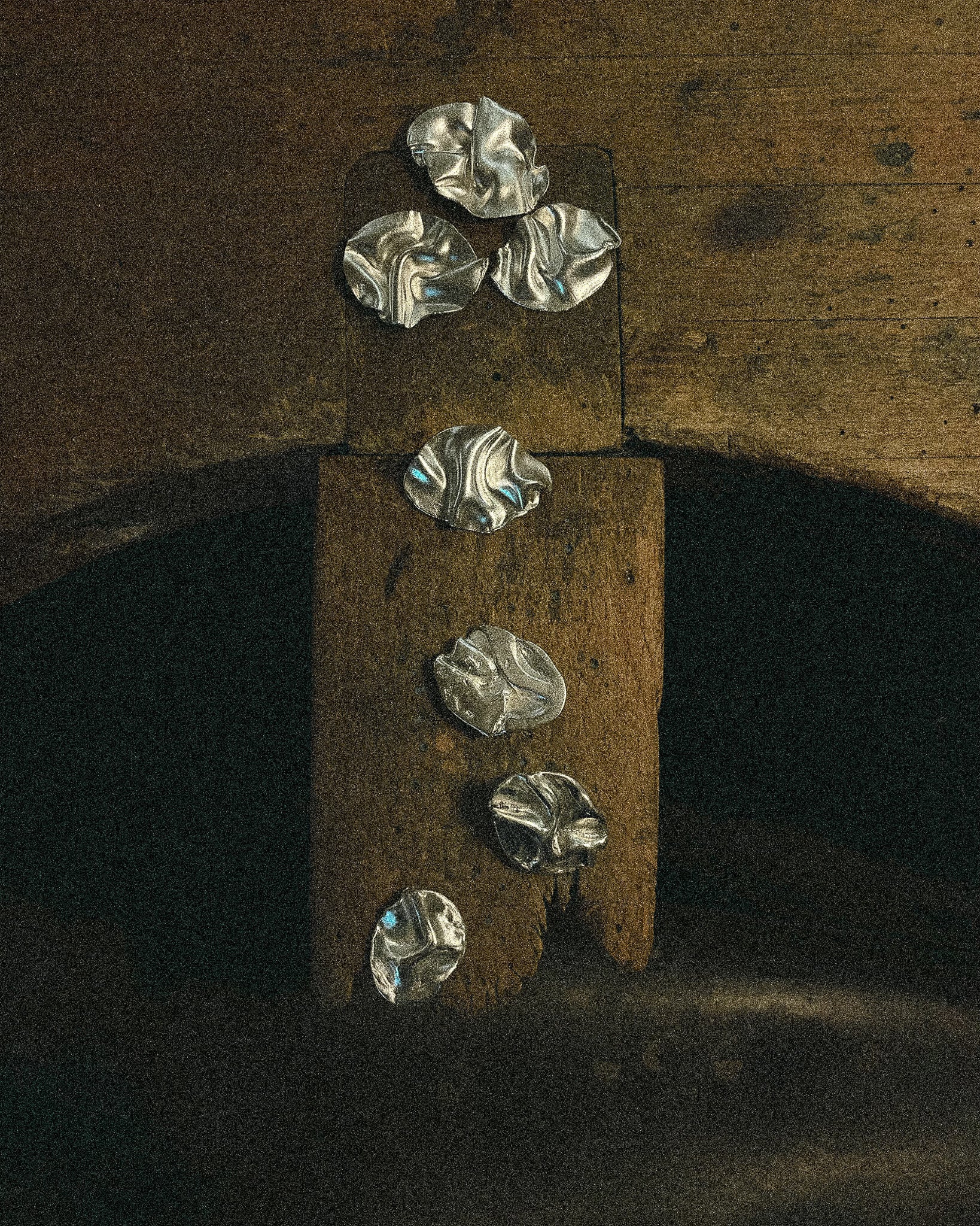 The pleat pieces are inspired by the soft, flowing lines of fabric pleats. The organic, handcrafted asymmetrical folds give each earring a distinct character, meaning no two pairs are exactly alike.
